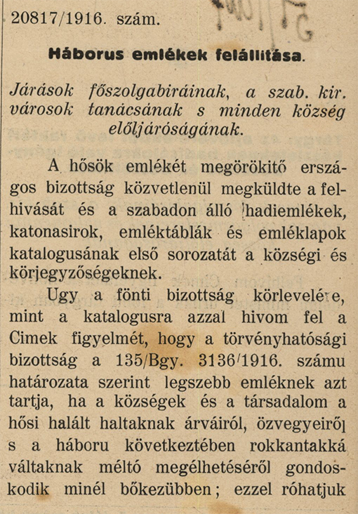 A háborúban elesett, eltűnt katonák emlékére törvény elfogadását javasolta 1915-ben báró Abele Ferenc vezérkari őrnagy. Ebben szerepelt, hogy minden település állítson emléket a világháborúban elesetteknek. A kezdeményezést támogatta gróf Tisza István miniszterelnök, aki beterjesztette a képviselőház elé az 1917. évi 8. törvénycikket. E törvény kimondta, hogy: