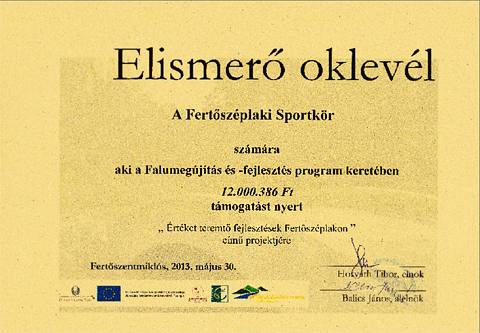 Köszönetemet fejezem ki mindenkinek, akik a pályázat megírásában részt vettek! Köszönöm a közreműködő szervezetnek, a Fertőszéplaki Római Katolikus Egyházközségnek és a Fertőszéplaki Sportkörnek, hogy példásan együttműködtek a pályázat előkészítésében!