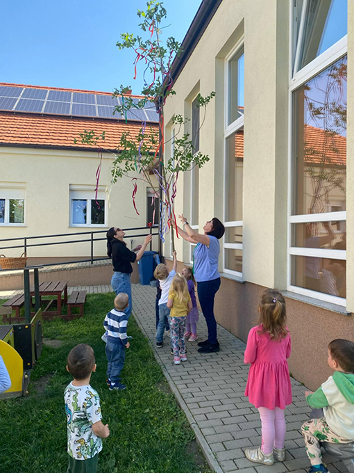 Óvodánk már három alkalommal nyerte el a Zöld óvoda címet. Az intézmény aulájában található faliújságon Zöld hírek keretében két éve adunk információkat, ötleteket a környezetvédelemmel, fenntarthatósággal kapcsolatban a gyerekeknek, és felnőtteknek. Ettől a tanévtől érzékelő fallal bővítettük az információforrást. A természetben fellelhető anyagokat lehet megfogni, megnézni, meghallgatni, megszagolni, összehasonlítani. Lehetőség van megszámolni a fák évgyűrűit. Központi helyet foglal el az akvárium aranyhalakkal, neon hallal, guppikkal, amelyek már kishalakkal is megörvendeztettek bennünket. Évszakonként változik a faliújság témája, melyet a gyerekek az óvó nénikkel érdeklődve figyelnek.