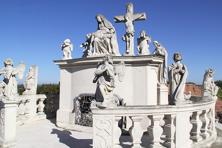 A szoborcsoport szobrainak zöme 1770-ben készült. A fallal körülvett kis dombra, az angyalok őrizte ajtón, és előírások szerint 21 lépcsőn jutunk fel.