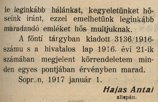 2. § Minden község (város) anyagi erejének megfelelő, méltó emléken örökíti meg mindazoknak nevét, akik lakói közül a most dúló háborúban a hazáért életüket áldozták fel."