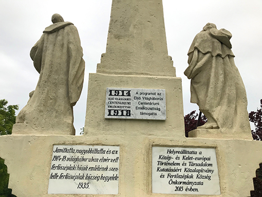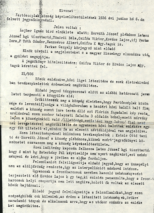 „Fertőszéplak közönsége és leventeifjúsága a világháborúban a hazáért hősi halált halt fiai emlékét a község Szent Imre terén álló szt. Flórián fogadalmi kép restaurálásával ezen szobor talapzati falaiba 3 oldalán behelyezett márvány lapon a községünkből való (illetőségű, születésű, vagy lakos) fiai nevének bevésetésével megörökítette és ugyanezen hősi halottak emlékére egy-egy fát ültetett el, minden fa az elesett névtáblájával van megjelölve.”