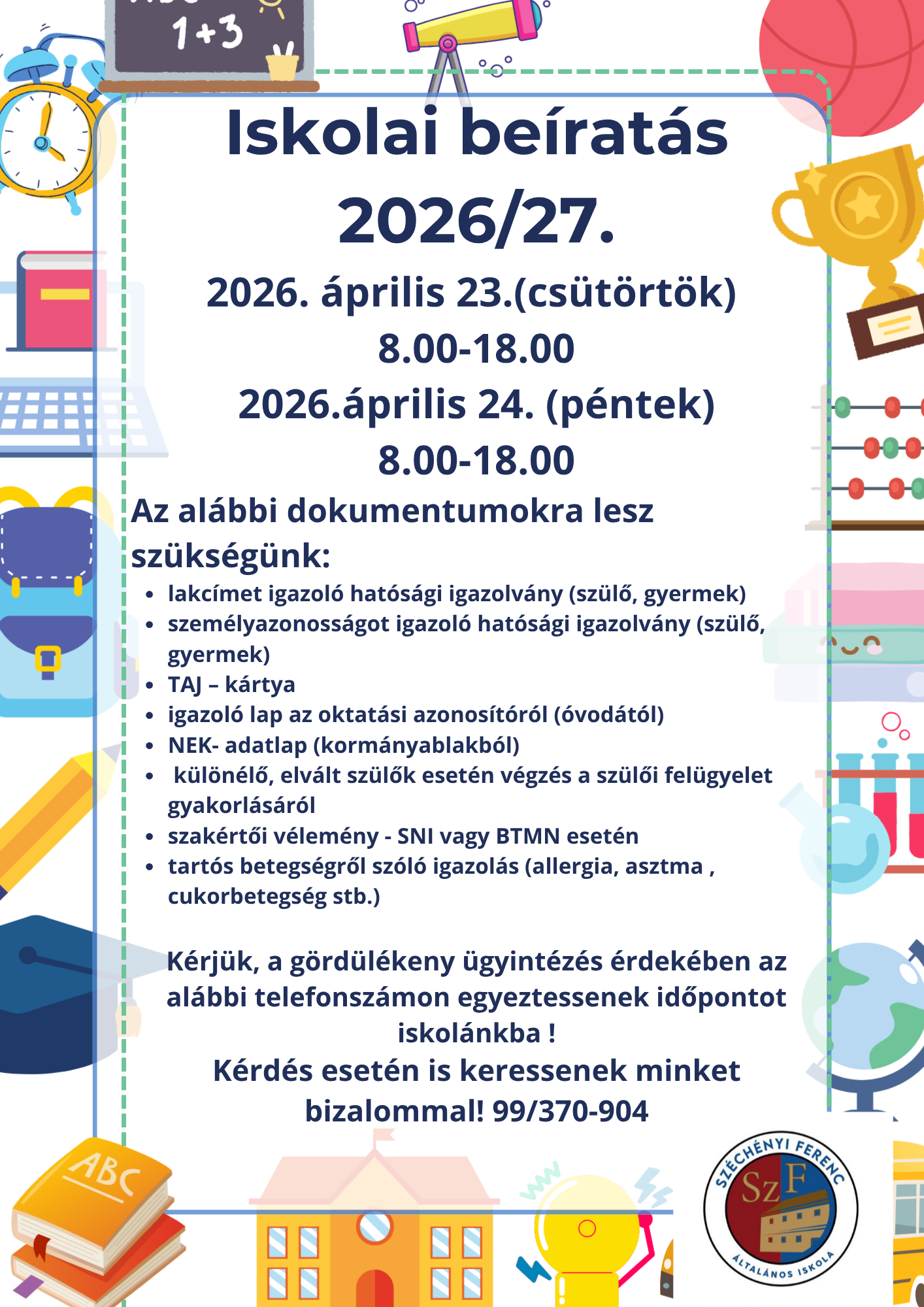 Tájékoztatom Önöket, hogy az általános iskolai beiratkozás időpontja intézményünkben: