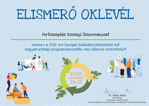 Az Európai Hulladékcsökkentési Héthez 2022-ben is csatlakozott Fertőszéplak Község programsorozatával. A sikeres részvételért ismét elismerésben részesítette az Energiaügyi Minisztérium Környezetünkért és Körforgásos Gazdaságért Felelős Államtitkársága!
