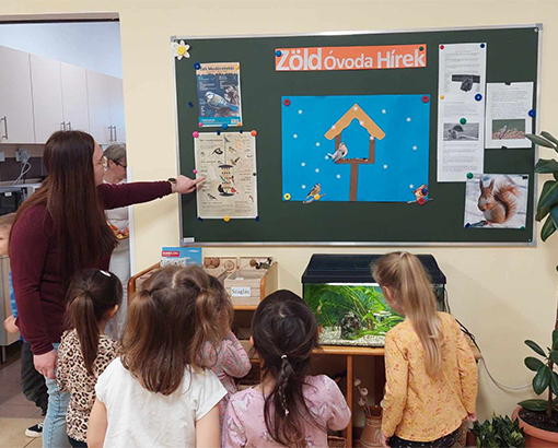 Óvodánk már három alkalommal nyerte el a Zöld óvoda címet. Az intézmény aulájában található faliújságon Zöld hírek keretében két éve adunk információkat, ötleteket a környezetvédelemmel, fenntarthatósággal kapcsolatban a gyerekeknek, és felnőtteknek. Ettől a tanévtől érzékelő fallal bővítettük az információforrást. A természetben fellelhető anyagokat lehet megfogni, megnézni, meghallgatni, megszagolni, összehasonlítani. Lehetőség van megszámolni a fák évgyűrűit. Központi helyet foglal el az akvárium aranyhalakkal, neon hallal, guppikkal, amelyek már kishalakkal is megörvendeztettek bennünket. Évszakonként változik a faliújság témája, melyet a gyerekek az óvó nénikkel érdeklődve figyelnek.
