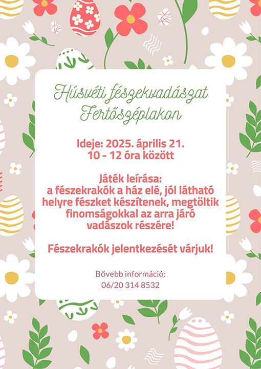 A játék REGISZTRÁCIÓhoz kötött, amely a Fertőszéplak Község Facebook oldal Húsvéti fészekvadászat poszt alatt lehetséges a cím megadásával!