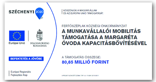 A beruházás a Magyar Kormány támogatásával valósult meg. A kormányzati támogatásból a fertőszéplaki óvoda sarródi tagóvodájának az udvarát is teljes egészében felújították. A közösség kül- és beltéri játékokkal egyaránt gazdagodott.
